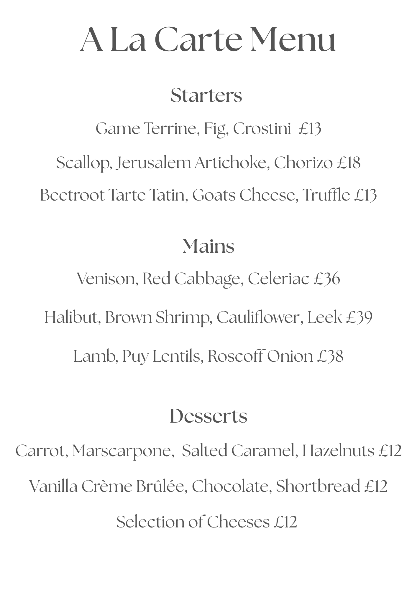 We also have our A La Carte Menu which changes with the seasons.Sample Menu.